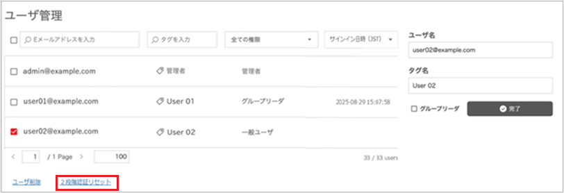 リセットしたいユーザにチェックマークを付けて、[2段階認証リセット] をクリックします。