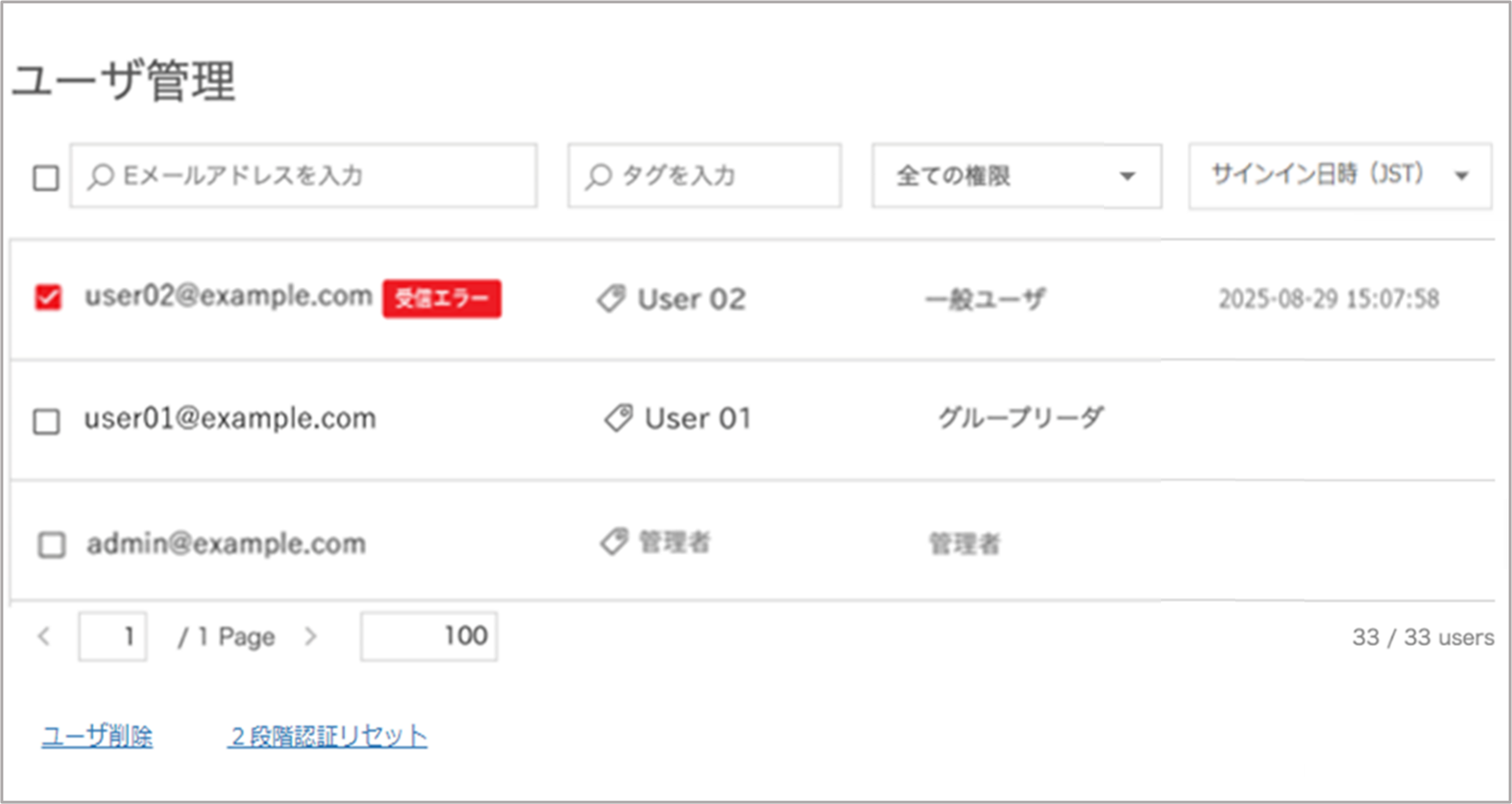 - メール送信停止状態のユーザは一覧の最上部に表示され、メールアドレスの横に
